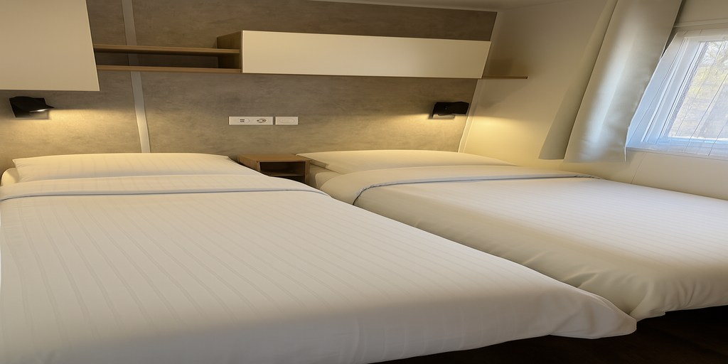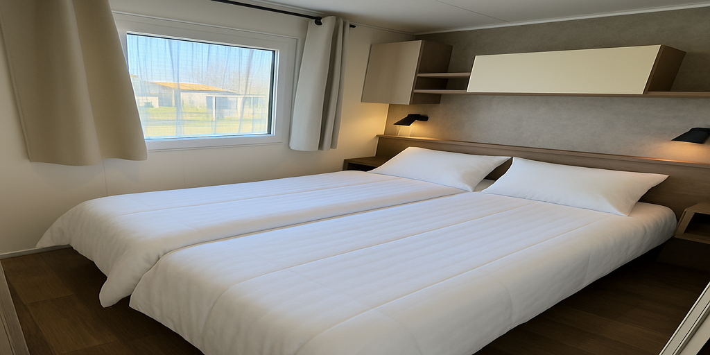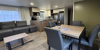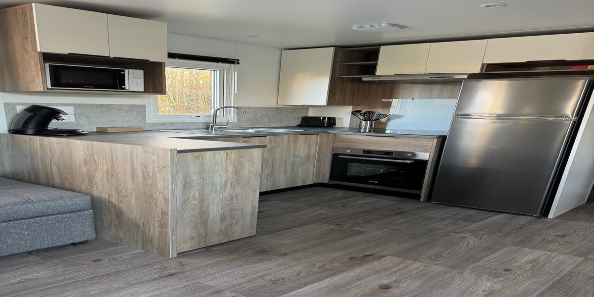 De woonkamer is voorzien van een comfortabele bank en een smart TV. De volledig uitgeruste keuken heeft een vaatwasser, keramische kookplaat, oven, waterkoker, Senseo en een Bialetti perculator. De badkamer beschikt over een douche en een wastafel met opbergruimte; het toilet is apart. Buiten zijn er een Boretti BBQ, een loungeset en twee ligbedden beschikbaar, evenals een parasol voor de zonnige dagen. Het chalet is geheel gas loos en duurzaam uitgerust met zonnepanelen.